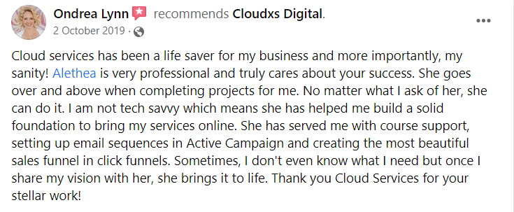 “I would recommend the services of CloudXS to anyone wanting a website done or refreshed. Alethea and the team listened to my wants and needs and executed all this above my expectations.”